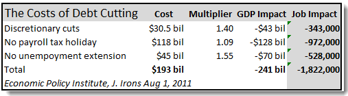 The outcome of this reverse causality, leading to austerity, is already projected. The final version of the bill just passed could cost up to 1.8 million jobs if only the following job killing cuts re put in place. From the Economic Policy Institute: